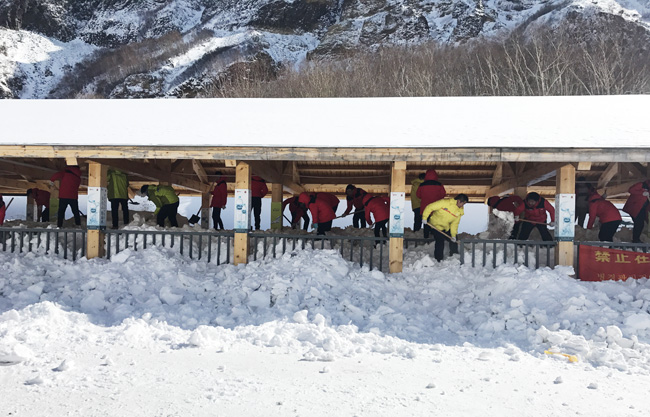 2017年3月5日,40余名志愿者在北景区老山门候车亭前集合,前往瀑布回廊清雪。长白山由于特殊的地理位置和气候,冬季雪期长、雪量大,经过一年积淀,回廊内积雪平均厚度已达1.5米,面对艰巨的任务,志愿者们用高涨的热情对抗天寒地冻,经过个6小时的奋战,下午三点回廊积雪被清扫一空,为迎接游人的到来做好了准备。
